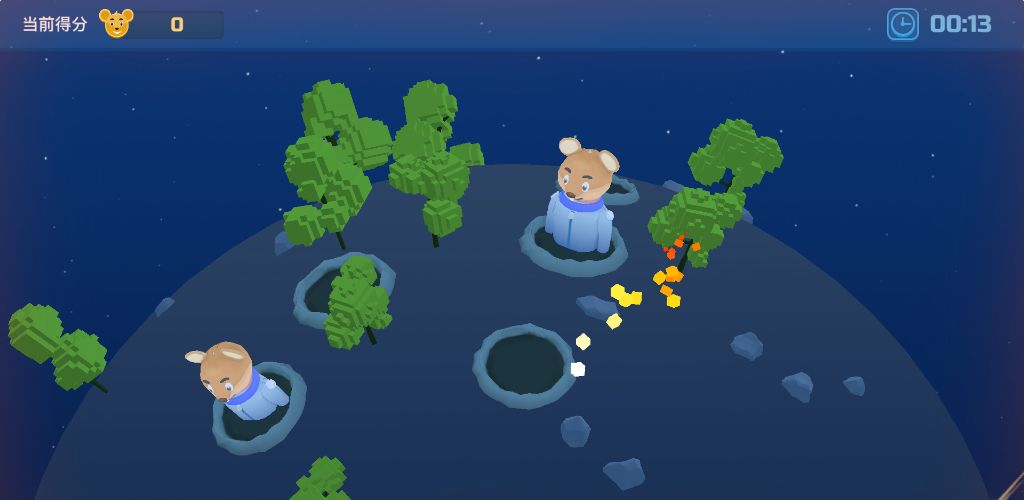暴打太空鼠最大的特色在于它颠覆了传统打地鼠游戏的玩法,加入了诸多创新元素。游戏场景设定在太空中,玩家需要在旋转的星球上追踪地鼠的踪迹,这种动态视角大大增加了游戏的难度。游戏中不时会出现炸弹等危险物品,玩家必须保持高度警惕,一旦误击炸弹就会导致游戏结束。游戏还设置了多种道具和特殊事件,比如时间加速、分数加倍等,让游戏过程充满惊喜。3D建模的太空鼠造型可爱又滑稽,被击中时的夸张表情和音效更是令人忍俊不禁,为游戏增添了更多欢乐元素。
