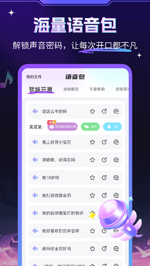 1、聊天变声:支持微信、QQ等各类变声,帮助你实现快速便捷变音。无论是想伪装成异性聊天,还是想用搞怪声音逗乐好友,都能一键实现。变声效果自然流畅,不会被轻易识破,让你的社交互动更有趣。