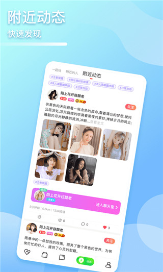 4、一键快速发现功能可以精准定位附近动态,让你轻松找到身边的同城好友,拓展社交圈。