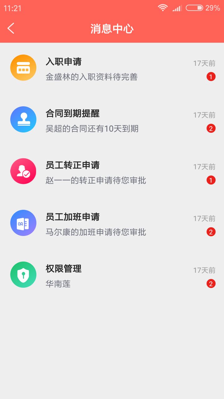 消息中心实时推送各类待办提醒:入职申请模块会提示新员工资料待完善事项,如"金盤林的入职资料待完善";合同管理模块提前预警到期合同,如"吴超的合同还有10天到期";员工转正申请显示待审批名单,如"赵一一的转正申请待您审批";加班申请功能汇集各部门申请,如"马尔康的加班申请待您审批";权限管理则记录系统操作日志,如"华南莲的权限变更记录"。所有消息按紧急程度分类,支持一键跳转处理,确保重要事项及时跟进。