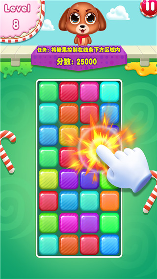 2、消灭糖果:延续经典消除玩法精髓的同时加入创新元素,不仅支持横向纵向消除,还新增斜线消除机制。当玩家一次性消除5个以上同色糖果时,会触发强力特效糖果,帮助玩家获得更高分数。