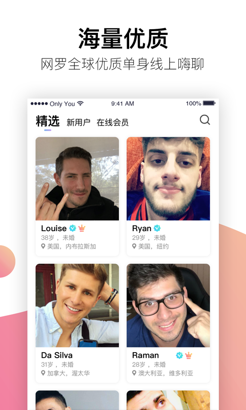 【海量优质】平台网罗了全球各地的优质单身用户,让你在线上嗨翻天,结识更多志同道合的朋友,扩大你的社交圈子。