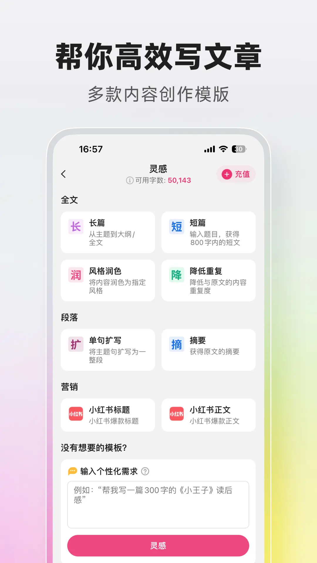 独具匠心地构建了规模庞大且内容丰富的灵感库,其中收纳了海量的名人名言、波澜壮阔的历史事件、前沿新奇的科学知识等素材资源。用户可以通过浏览灵感库,快速找到与创作主题相关的素材,丰富文章内容。灵感库还支持关键词搜索与智能推荐,帮助用户高效获取所需信息,让创作过程更加顺畅。