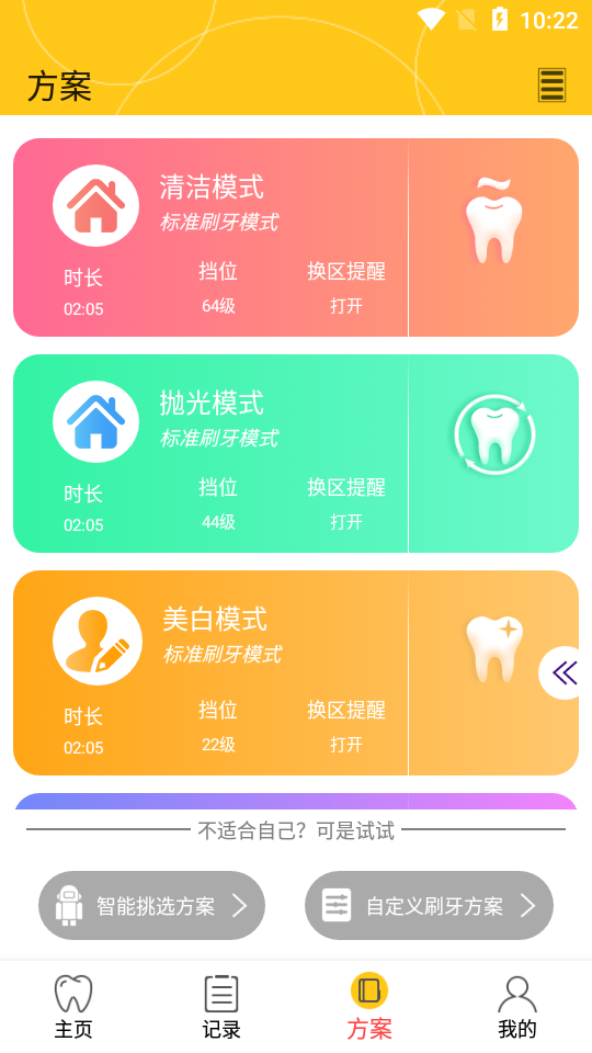 1.可根据实际情况进行模式选择:软件提供清洁、美白、敏感、按摩等8种专业刷牙模式,用户可根据当天口腔状况自由切换。每种模式都经过科学测试,能针对性地解决不同口腔问题,提升护理效果。