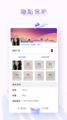 【完善的隐私政策】设置视频相册锁,会员才可查看,可随时关闭个人资料。平台还提供了多种隐私保护功能,如匿名聊天、资料隐藏等,让用户能够根据自己的需求灵活调整隐私设置,确保个人信息的安全。