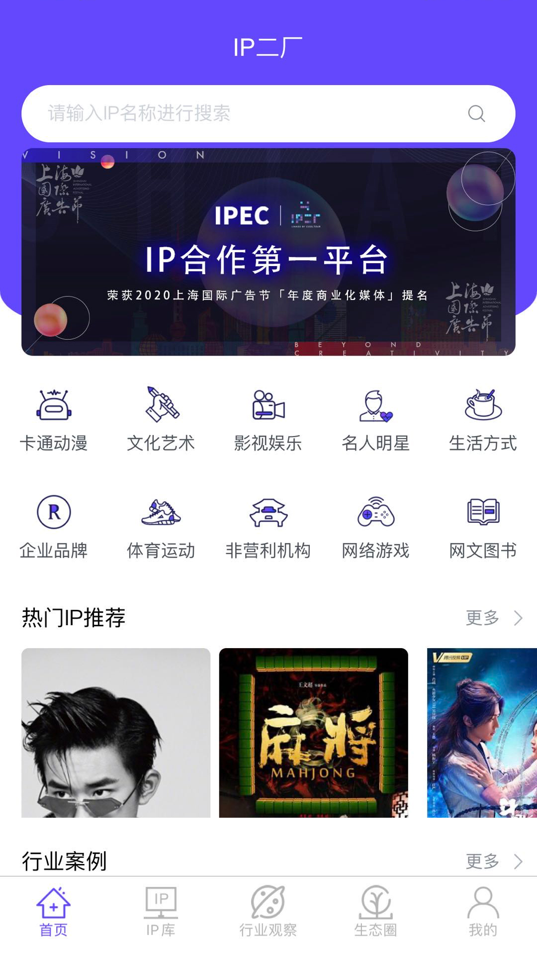 选IP、用IP、玩IP,IP合作第一平台!IP二厂app收录了包括文化艺术、娱乐、名人明星、生活方式、企业品牌、体育、非营利机构、网络游戏、网文图书等十大领域的IP资源,打造了全中国最新最全的IP收录库。无论您是寻找热门IP进行商业合作,还是探索小众IP进行创意开发,IP二厂app都能满足您的需求。通过智能化的搜索和推荐功能,用户可以快速找到符合自身需求的IP资源,享受高效便捷的IP合作体验。