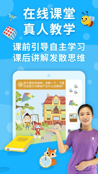 真人教学,全程伴学——专业老师课前知识点梳理,引导儿童自主探究;课后结合具体知识点详尽解析,使儿童思维能力得到提升;
