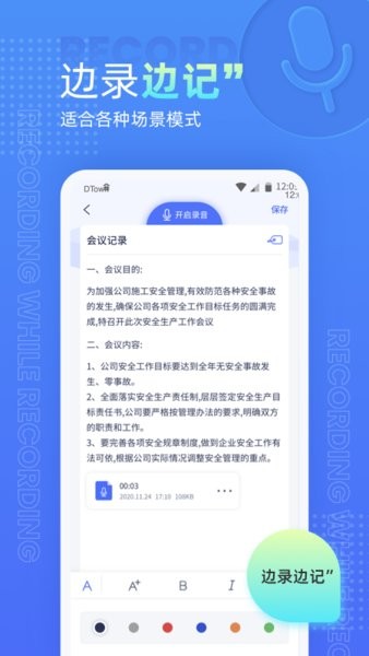 录音笔记软件是一款集录音、翻译、记录于一体的高效办公工具,专为现代快节奏的工作环境设计。无论您是在会议中、课堂上还是日常生活中,这款软件都能帮助您快速捕捉重要信息,并通过实时翻译和文字转换功能,将语音内容迅速转化为可编辑的文本。通过这种方式,您可以更加便捷地整理和保存所需内容,确保在关键时刻不会遗漏任何细节。录音笔记软件不仅提升了办公效率,还为用户提供了更加智能化的记录体验,让您随时随地都能高效工作。
