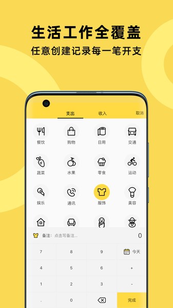 4、只需要几秒钟的时间就能够快速记录,而且所有的消费和收入都能细致分类。预设20+常用消费类别,支持自定义添加新类别。
