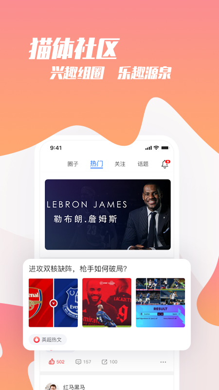 2、「猫体圈」球迷社区,热点话题。高度一致的兴趣爱好,让你快速找到组织。在这里,您可以与全球的球迷一起分享比赛心得,讨论热点话题,参与各种有趣的互动活动,感受体育的魅力和激情。