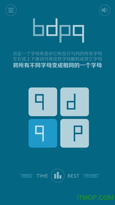 游戏操作十分直观:点击任意字母即可选中该字母所在行与列的所有字母,然后通过左右或上下滑动来将bdpq这四个字母相互转换。游戏目标是将所有不同字母统一为同一种字母。看似简单的机制背后隐藏着极其复杂的逻辑关系,需要玩家进行深入思考和反复尝试。作为开发者,我特别期待能有高人研究出一套通用的解法公式来还原这些字母。不过目前看来,每个玩家都需要找到属于自己的解题思路,这也是游戏最大的魅力所在。