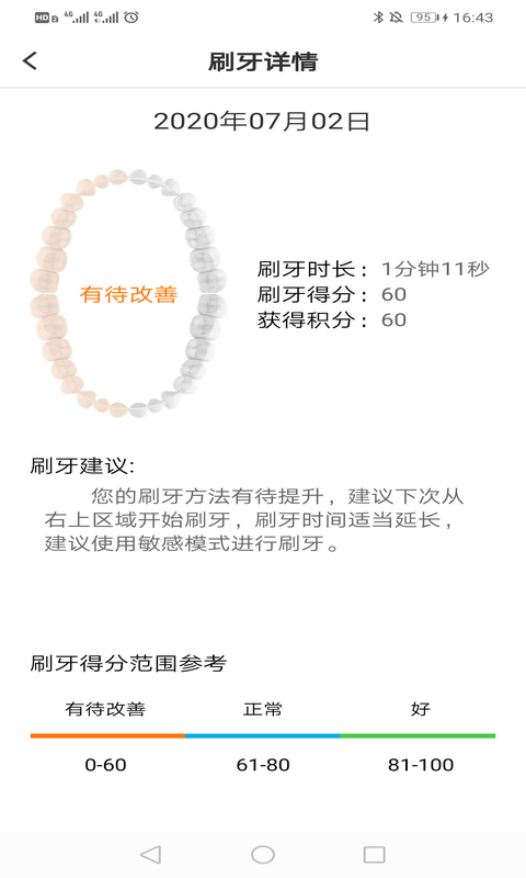 支持通过app设置设备的工作模式、刷牙时长和刷牙起始区域,满足用户个性化的刷牙需求。软件还提供刷牙引导功能,通过动画和声音引导用户正确刷牙,并根据刷牙时长和起始区域给出评分,帮助用户养成良好的刷牙习惯。此外,软件还能显示设备的详细信息,如电池电量、刷头剩余天数、牙刷的工作模式设置以及刷牙记录,让用户随时掌握设备状态。软件还支持记录设备数据,并以图表形式显示日、周、月的统计数据,帮助用户全面了解自己的刷牙情况。