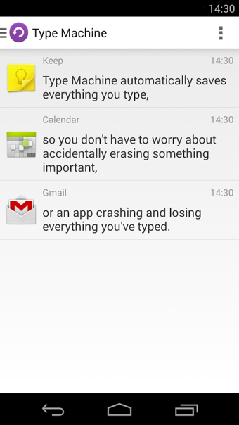 你曾经输入的东西,然后小心删除了吗?记录了一些重要的东西,但突然找不到了?应用程序崩溃,大段文字白输?文字时光机TypeMachine帮你解决这一切难题。TypeMachine把你的每一次输入都原封不动地保留下来,一旦出了问题,回到时光机里复制,绝不会再丢失任何一段文字!