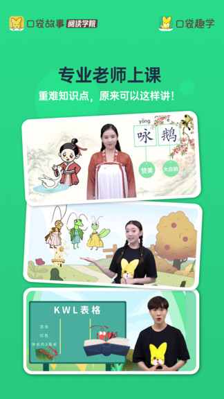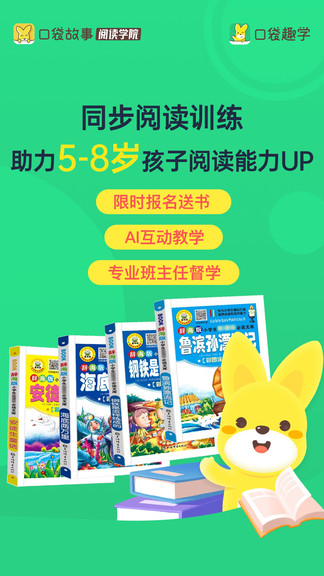 目前已上线的”互动阅读系统课“是“口袋趣学”依托”口袋故事?阅读学院“研究成果,专为4-12岁孩子打造的系统性阅读课程体系。课程体系以大语文能力发展为落脚点,结合美国CCSS分级阅读要求及新课标要求,设计6阶段阅读体系。内容选择、阅读量设计、阅读难度梯度、课程呈现方式等,严格按照儿童认知发展规律设计。通过”互动阅读系统课“的学习,孩子不仅能积累学识、拓展视野、学会独立思考,还在愉快学习中掌握了阅读方法,学科考试也不在话下。
