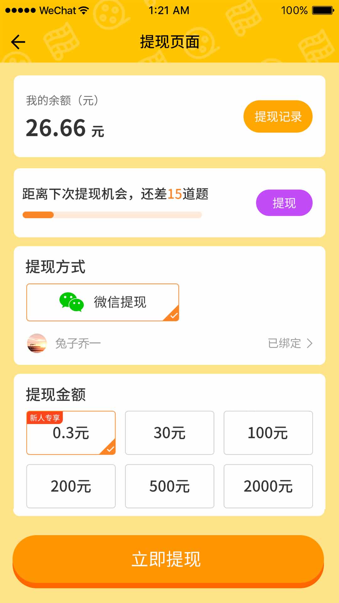 2、单笔提现金额最低0.3元;提现额度会随着用户等级提升而增加,活跃用户可享受更高提现限额。