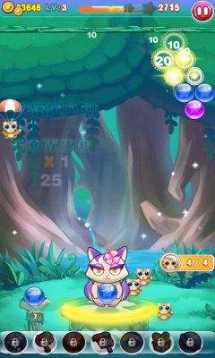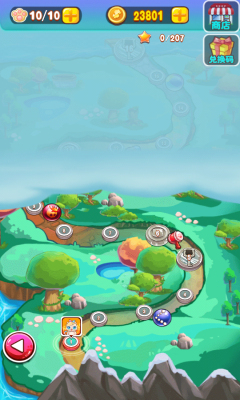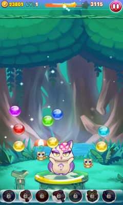 2.选择对应的关卡开始游戏,当3个或3个以上相同的泡泡撞击在一起时即可消除,注意观察泡泡颜色分布,制定最佳射击策略;