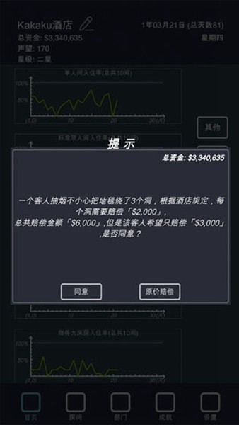 模拟经营我的酒店是一款由KakaKuGames开发的沉浸式文字经营游戏,采用极具质感的暗色系UI设计,真实还原现代酒店管理场景。作为酒店CEO,您将全面掌控从客房定价到员工管理的每个细节,通过实时数据面板分析入住率、客户满意度等20余项经营指标。游戏独创动态经济系统,您的每个决策都将影响酒店声誉与收益,无论是打造顶级奢华套房吸引名流,还是推出特惠房型提高周转率,都能体验从零开始打造商业帝国的成就感。独特的员工忠诚度机制和随机事件系统,让每次经营都充满未知挑战。