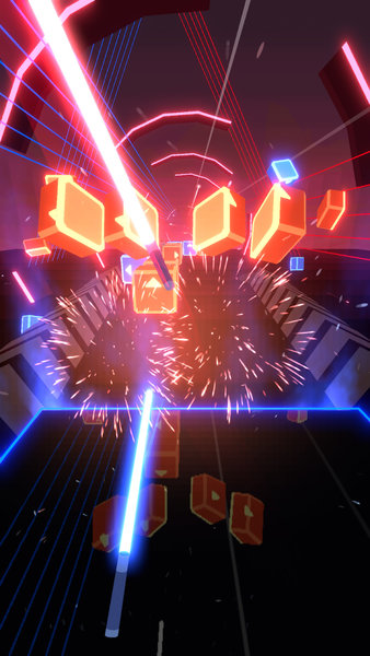 3.感受节拍的律动,向左或者向右滑动,避开路上的所有障碍物,并挥动手中的武器切开方块:游戏操作直观易上手,但想要成为真正的节奏大师,需要反复练习掌握每个音符的精准时机。