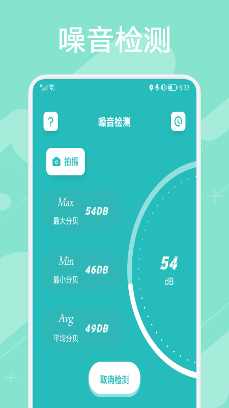 1、提供专业级噪音检测功能,支持实时显示当前环境分贝值,用户可随时查看详细的数据分析报告,了解噪音变化趋势。