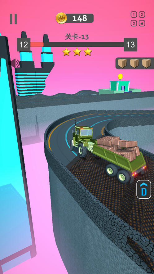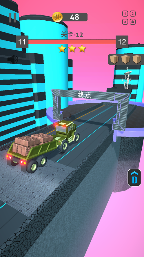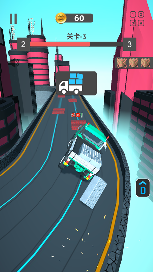 操作汽车向前冲刺,玩家可以选择不同的座驾突破关卡。根据任务特点选择合适的车辆,比如山地运输选用越野性能强的四驱车,长途货运则选择大容量卡车。