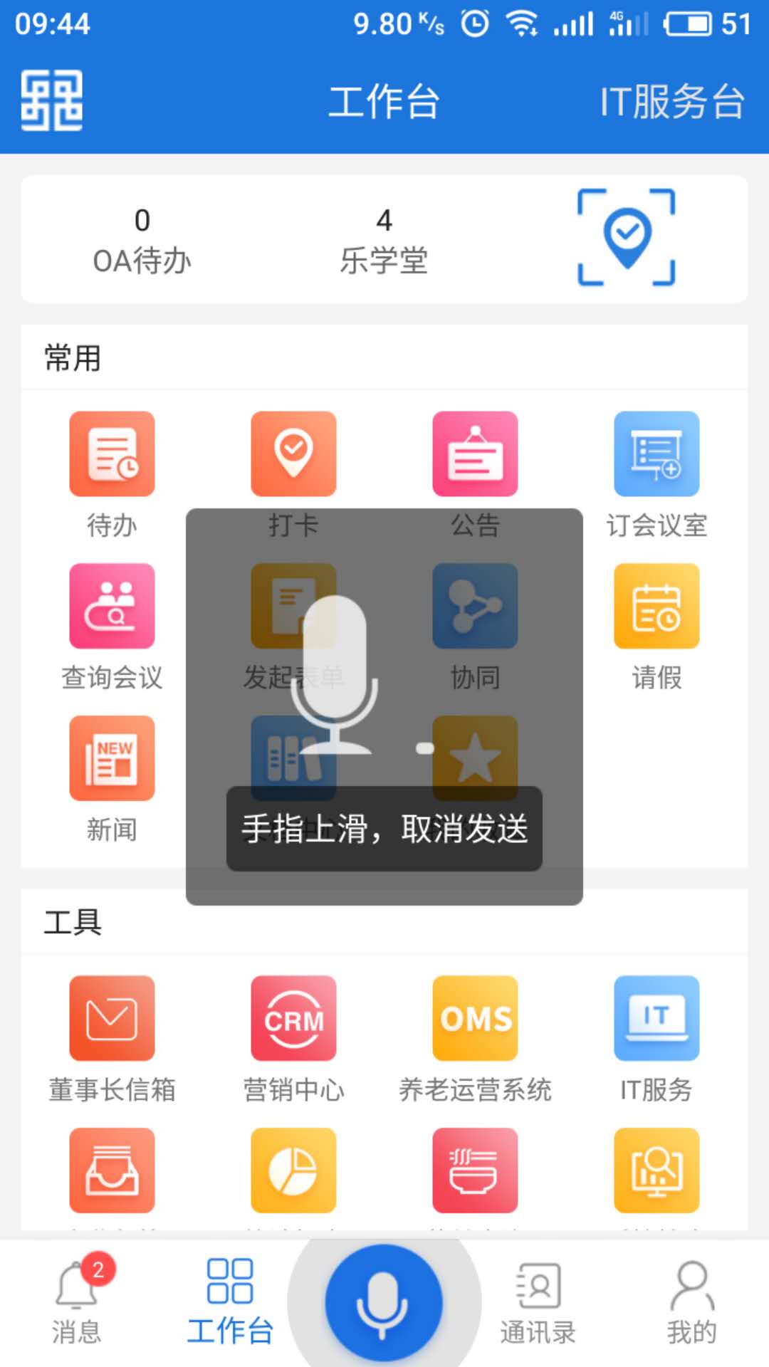 8、工作台:聚合企业所有IT系统入口,包含40+常用办公工具。支持自定义功能模块排序,快速访问OA流程、IT工单、会议室预约等服务。新增智能语音助手,通过自然语言指令即可完成复杂操作。