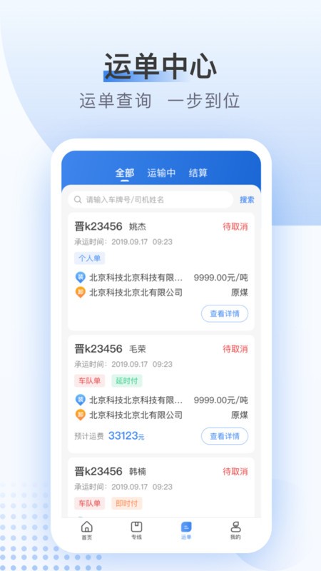3、丰富的订单基本内容,从订单标签上能看到到线路信息、司机名字以及运输状态等多种内容;订单详情页展示完整的运输信息,包括货物照片、装卸要求等。用户可以通过时间轴查看运输进度,重要节点自动推送提醒。