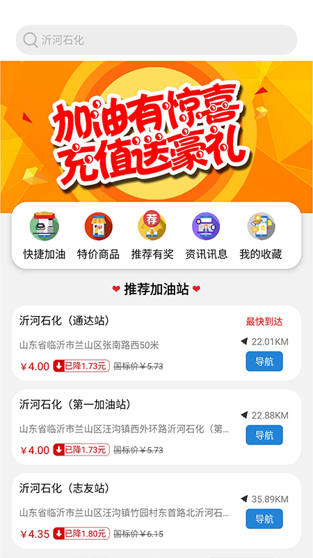 1、打开APP后系统会自动推荐附近优惠加油站,用户也可手动搜索特定区域或品牌的加油站;