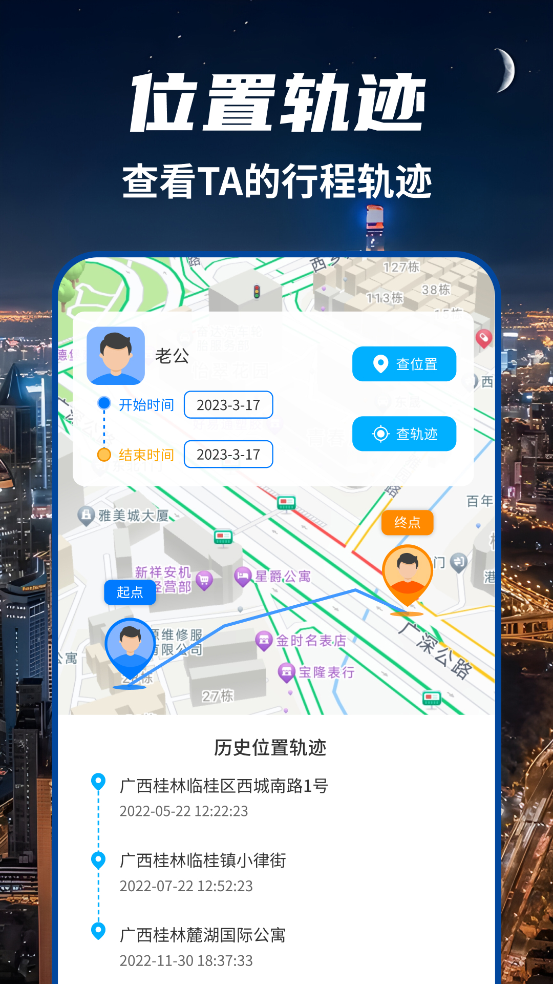 软件采用高精度定位技术,能够实时更新并共享用户的位置信息,让亲友随时掌握您的行踪。用户可自定义共享时长和范围,灵活控制隐私权限。无论是日常接送孩子、朋友聚会,还是团队出行,都能通过实时位置共享提升协作效率与安全性。同时,软件还支持历史轨迹回放功能,方便用户查看过往行程记录,为安全出行提供更多保障。