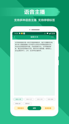 文字转助手是一款功能全面的文字转语音应用软件,适用于多种场景需求。无论是需要将小说内容转换为有声读物,还是在商场促销活动中播放广告语音,甚至是地摊叫卖时的自动播报,这款应用都能完美胜任。它支持多种文本格式导入,用户可以根据实际需求调整语音的语速、音调和音量,打造个性化的语音效果。此外,应用还提供丰富的背景音乐选择,让转换后的语音更具吸引力,满足不同用户的多样化使用场景。