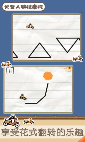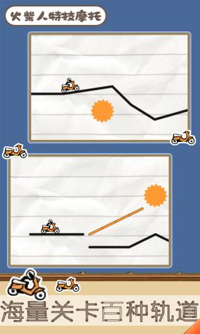 上手容易,但难度有可能比较大。本作就是如此,实际控制就依靠两大法宝:点击屏幕左侧为刹车、右侧为加速,然后摇晃设备控制火柴人摩托车的,但实际玩起来可一点不轻松,要想拿到三星评价不多试几次可不行。本作的画面也比较简单,前景为永恒的黑色,看上去有剪影效果;背景则是根据不同主题有不同的颜色,游戏虽然仅仅是纯2D的画面,但在前景色和背景色的搭配下,比起很多类似的火柴人游戏都要感觉更清晰舒适。操作简单的本作最大的挑战在于时间。每个小关的流程都不长,只要到达旗子处即可,但要拿到星级评价的话就得多熟悉一下关卡,贸贸然往前冲只会让可怜的火柴人“粉身碎骨”,而且这货还把火柴人怎么凄惨死去的画面展示给你看...真触目惊心啊。建议玩家在挑战时多观察关卡布局,掌握最佳时机进行加速或刹车,这样才能顺利通关并获得高分。