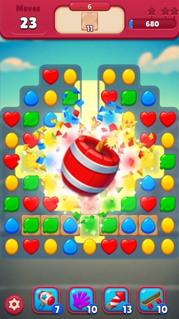 4、游戏有不同的道具生成,横向消除、纵向消除、魔法消除以及炸弹消除统统都有。道具系统设计平衡且富有创意,玩家可以自由组合使用,创造出千变万化的消除策略。