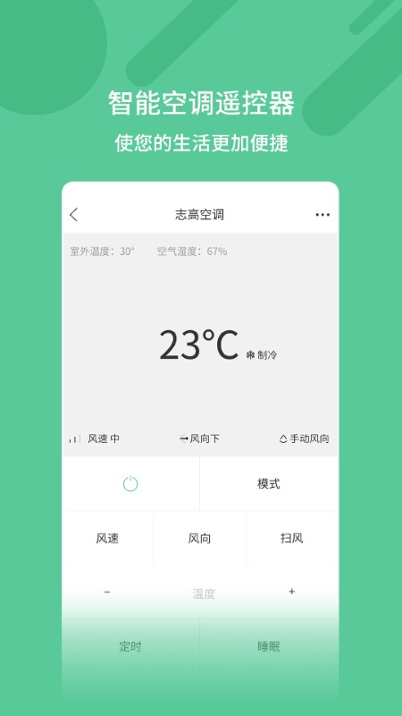 万能空调智能是一款专为智能家居打造的遥控软件,它能将您的手机变成万能遥控器,轻松控制各类家电设备。无论是空调、电视还是其他智能家电,只需一部手机即可实现远程操控。软件界面简洁直观,操作便捷,支持多种品牌设备适配,让您告别传统遥控器的繁琐。未来还将持续更新更多功能,为用户带来更智能、更便利的生活体验。