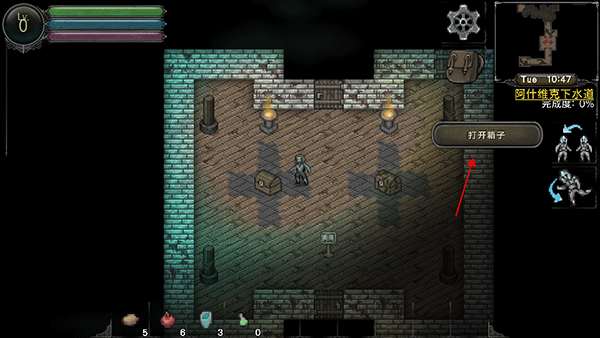4、游戏采用虚拟摇杆操控方式,左侧控制角色移动,右侧为动作按钮。靠近场景中的宝箱时会出现交互提示,点击即可开启获取里面的物品。