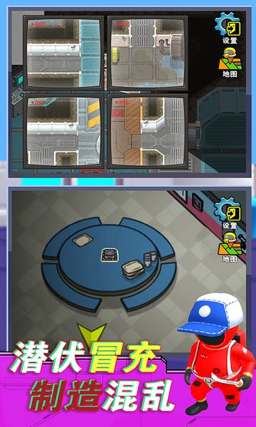 -未知探索,搜寻任务,在我们之间寻找狼人破坏者。飞船地图会随机生成任务点分布,每局游戏的探索路线都不相同。新增的监控系统可以让玩家通过摄像头远程观察其他区域的情况。