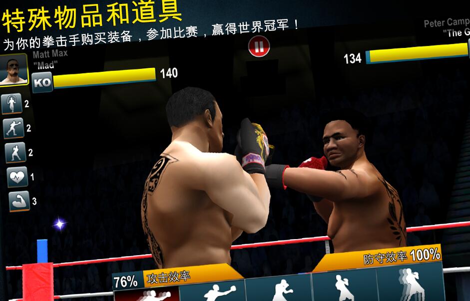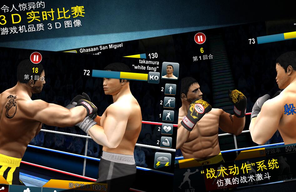 2、真实还原现代拳击运动,收录了多位知名拳击明星的招牌动作和技能,让玩家感受职业拳击的魅力;