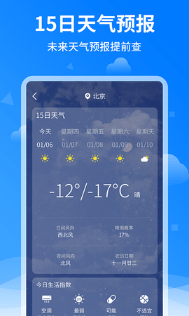 2、【7日天气预报】简单的7日天气、风向、温度、空气质量预报,为用户提供中长期天气趋势参考,特别适合计划旅行或重要活动的人群使用;
