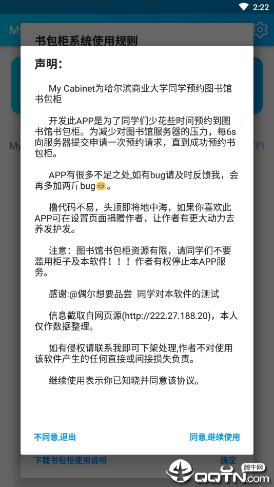 MyCabinetapp是哈尔滨商业大学专为师生打造的图书馆书包柜预约服务应用,不仅简化了书包柜预约流程,还创新性地整合了网课答案查询功能。通过这款APP,用户可以轻松预约图书馆书包柜,同时还能快速获取超星尔雅、智慧树知到等主流网课平台的课程答案。其智能化的设计让学习生活更加便捷,悬浮窗和翻译功能更是提升了使用体验,真正实现了"一站式"解决学习和储物需求。