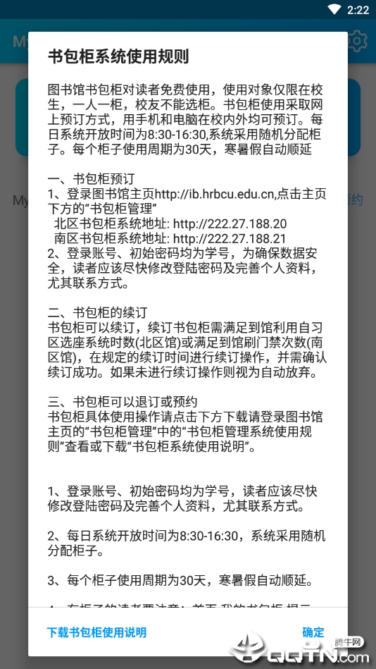 5、续订书包柜需满足到馆自习时长要求,系统会记录用户在自习区选座系统的使用时长。符合要求的用户可在续订时间内操作续订,操作后务必确认成功;未操作视为自动放弃。未达标者需等待预约时间重新预约,这一机制鼓励学生充分利用图书馆资源。