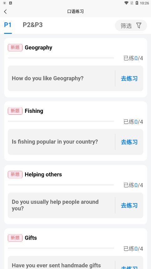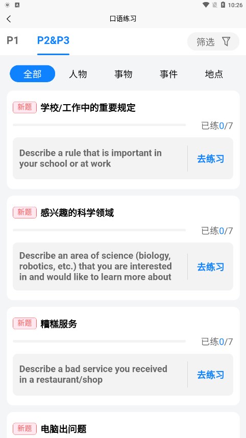 3、多样化口语题材:提供丰富的练习内容和逼真的考试模拟环境。从日常对话到学术讨论,从简单问答到深度交流,全方位满足不同阶段的备考需求,让您随时获得专业评估。
