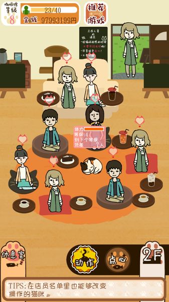 3、游戏加入了体力值设定,猫咪在卖萌安慰客人时会消耗体力。当体力不足时,猫咪会进入午睡状态自动恢复。玩家需要合理安排猫咪的工作和休息时间,确保咖啡馆的运营效率。体力系统让游戏更具策略性,也让猫咪的行为更加真实可爱。