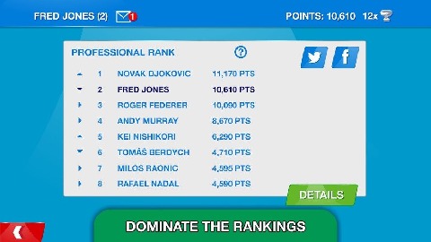 7、完善的排名系统让玩家可以不断挑战自我,来拿到更高的世界排名,成为真正的网球大师。
