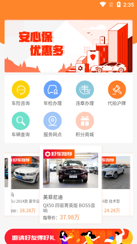安车围服务平台app是一款专注于互联网汽车服务的综合平台,致力于为用户提供便捷、高效的汽车相关服务。通过该软件,用户可以轻松办理年检、违章处理、车辆查询等多项业务,享受一站式服务体验。此外,安车围还推出了“安心保”等多重保障,确保用户用车无忧。现在下载安车围app,邀请好友注册,还能获得丰厚的现金奖励。无论是日常用车需求,还是汽车后市场服务,安车围都能满足您的需求,快来下载体验吧!