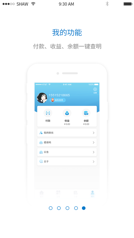 5、我的功能付款、收益、余额一键查明。用户可以在“我的”页面中查看付款记录、收益情况和账户余额,方便管理个人财务。