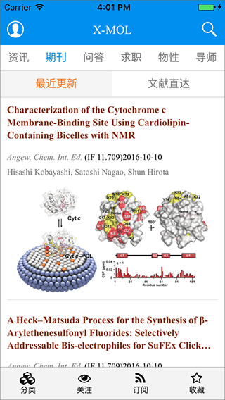 xmol科学知识平台app收录了包括Nature、Science、NatureChemistry、JACS等数十种国际顶级期刊的最新论文信息,每日更新图文内容,让用户查阅文献更加便捷高效。平台还支持个性化订阅,用户可根据需求选择感兴趣的期刊。如果您有其他期刊需求,欢迎随时联系我们,我们将尽力满足您的需求。