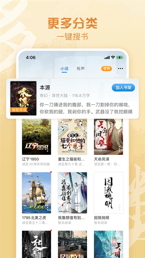 4、【超全书库】正版精品图书、海量网文神作,你想看的全都有,覆盖各类题材,满足不同读者的阅读偏好。