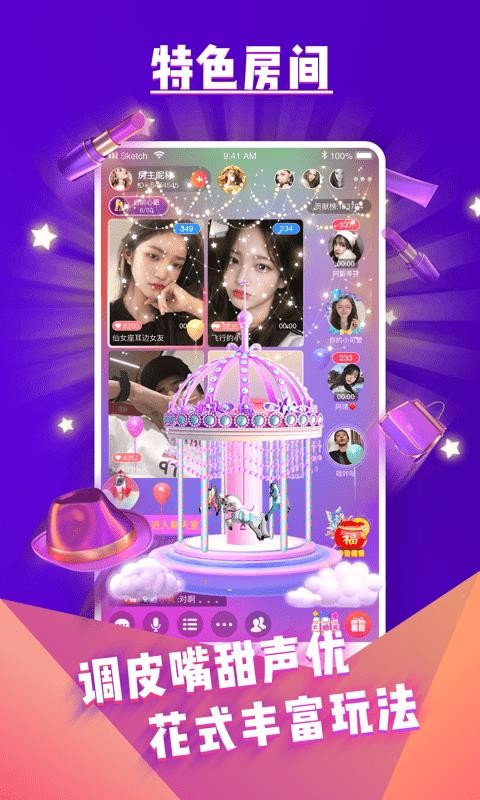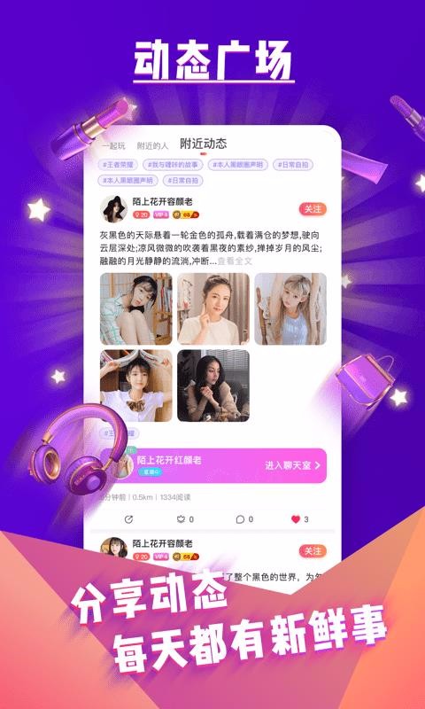 1、动态分享功能让用户可以在广场上展示生活点滴,比如分享今天新买的裙子照片,记录美好瞬间;2、动态互动功能支持用户通过动态直接进入作者创建的聊天室,实现从内容浏览到实时交流的无缝衔接;3、内容传播功能允许用户转发感兴趣的动态,一键分享给更多朋友;4、社交关系管理提供关注功能,用户可以轻松关注心仪的好友,建立稳定的社交网络;5、自主社交空间功能支持用户创建专属聊天室,定制个性化的交流环境;6、情感表达功能提供丰富的打赏礼物,用户可以选择精美礼物赠送给好友,传递心意。