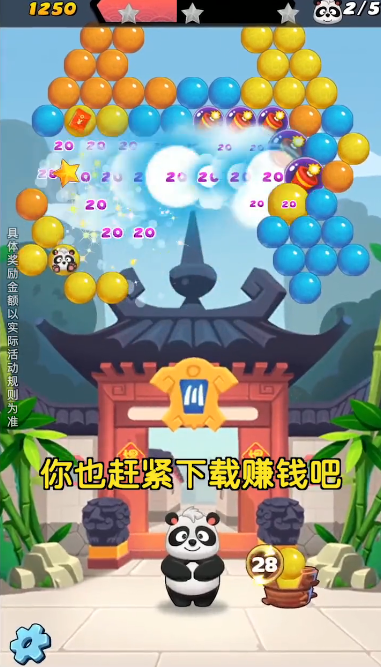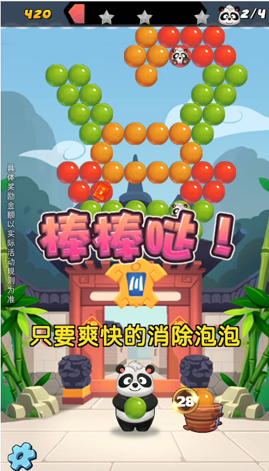 游戏中,大量的泡泡会以不同的形状和颜色出现在熊猫的头顶上,形成独特的关卡设计。相同颜色的泡泡通常会聚集在同一区域,方便玩家进行瞄准和射击。玩家需要根据泡泡的颜色和位置,精准地调整射击方向,以消除更多的泡泡。这种设计不仅增加了游戏的策略性,也让每一关都充满新鲜感。此外,游戏还融入了红包奖励机制,完成任务后可直接获得现金奖励,为玩家带来更多惊喜。