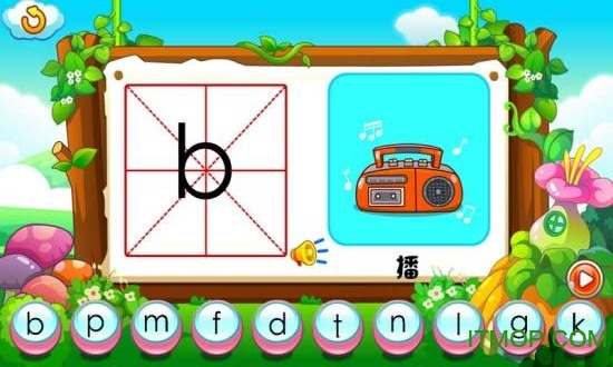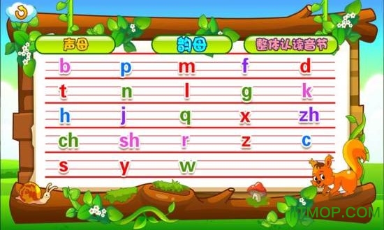 声母学习模块:通过互动动画和发音示范,帮助孩子认识23个声母的正确发音和书写方式。