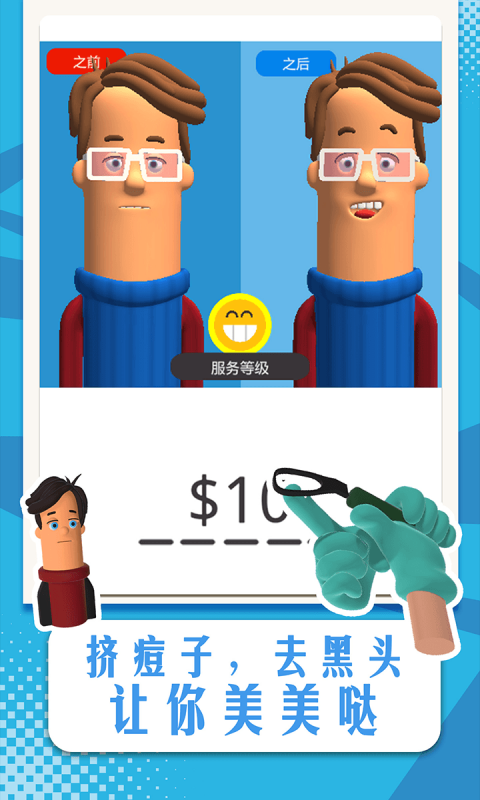 《我贼溜》是一款极具趣味性的美容模拟游戏,玩家将化身为一名专业的美容医生,通过为患者提供各种美容服务来赚取金币。游戏涵盖了挤痘痘、去黑头、去角质等多种美容项目,操作简单易上手,适合各个年龄段的玩家。在游戏中,玩家需要根据不同患者的皮肤状况,选择合适的治疗方式,确保每位顾客都能满意而归。游戏不仅提供了丰富的玩法,还融入了轻松的背景音乐和细致的画面设计,让玩家在享受游戏乐趣的同时,也能感受到解压的愉悦。