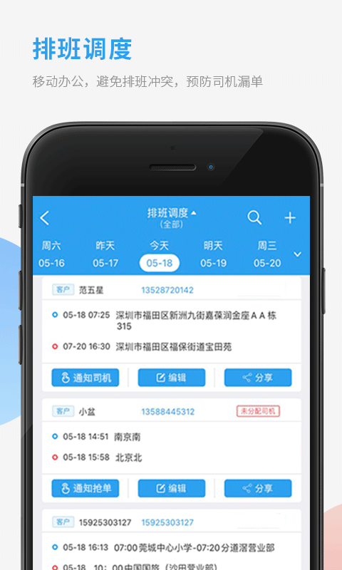 实现移动端智能排班管理,自动检测排班冲突,预防司机漏单情况发生,支持任务一键派发和状态实时更新,提升调度效率。
